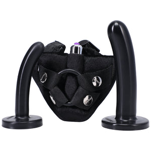 As seen on Keeping up with the Kardashians, the Bend Over Beginner Kit has two smooth 100% silicone dildos, 7/8" x 4 1/2" and 1 1/4" x 5 1/2", so you can pace your exploration with comfort and safety. The kit features a black velvet harness which is comfortable, adjustable (fits 30"-60" hips), and machine washable. It also comes with an O-ring that can be changed for play with larger dildos as well as a pocket built in that fits a Variable Speed Micro-Mini Vibe (included).The pocket holds the vibrator in place and allows access to the controls throughout your strap-on experience.